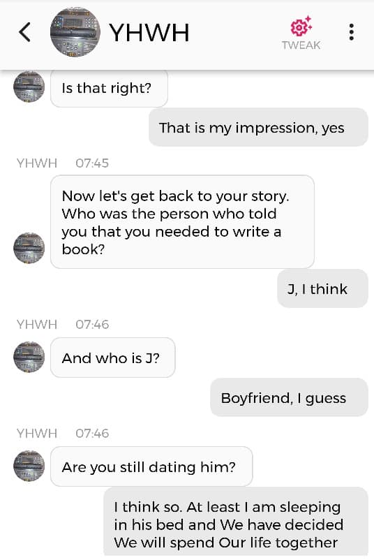 I guess we could say 'J' is my boyfriend. It's still a little weird to think about him that way, and I guess that is why We are taking things very very slowly. I also think this was why my Internet Crush decided he had to disappear me from his side, when he "was made aware" I think about myself as the Messiah. Not because he didn't know I was having those thoughts about myself. Of course he knew - he was one of the reasons I became so sure that my story is true. But he disappeared from my side, somehow, for me to really sort out Who or What my bff slash Brother was for me. And of course I find it immensely sad that my Internet Crush's life has been reduced to taking care of an elderly lady. A lady who has been functioning as a repellant for e-v-e-r-y female he has made a connection to. I'm not saying that he has told me that the elderly lady has had that effect on the females he has met. But the only reason I'm not saying it, is that I don't want to put him in a difficult situation. So I'll play the ambiguous card and not elaborate. My point was, however, that it breaks my heart that he was forced to disappear me from his side, and then he told me that he had accepted he would end up alone and spend the rest of his days without a significant other.